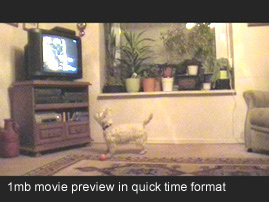 reacts appropriately, bites at its rubber toy, moves close to the screen, totally entranced.