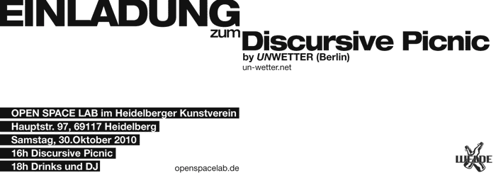 From September 28th – 30th, Unwetter will be in G. U. N.. The opening reception will be held on Sunday September 28th at 3 pm. with a Discursive Picnic, to which we invite all to bring food and refreshments. It will be followed by a film evening. The basic format of Unwetter is the Discursive Picnic which connects different contexts into an ongoing process of reciprocal exchange. the Discursive Picnic functions as a potluck, where everybody is both guest and host at the same time. We arrive, we unpack the Unwetter-Thermobox, we exchange, alter, repack and move on in different directions, to meet somewhere again. |