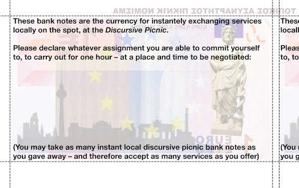 Discursive Picnic_8 Hours Don't Make a Day, Thursday September 4th, 2008 from 8 am till 4 pm at Alexanderplatz – between exit U2 (in front of Saturn at Alex) and the Fountain of the Friendship between Peoples with Matthias Krause and Patrick Gardener. -------------------------------------------------------------------------- |